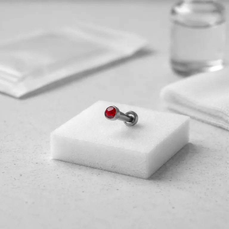 Para joia inicial, o padrão mais seguro é um labret interno reto em titânio ASTM F136, com comprimento em torno de 8 mm, e não uma argola logo de início. O labret em titânio (ou titânio de alta qualidade equivalente) distribui melhor a pressão, facilita a limpeza e reduz o risco de queloide e de cicatrização problemática em peles mais sensíveis. Argolas em aço cirúrgico 316L ou em ouro gold 14k podem entrar depois, mas começar com argola apertada é receita para trauma mecânico e para meses extras de inflamação.